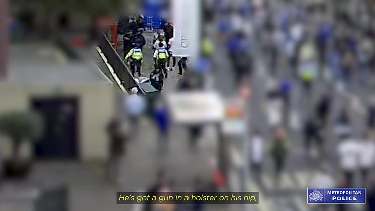 Armed officers were dispatched but given the potential risk, unarmed officers who were on duty policing the match also responded. Seeing the suspect walking towards the busy crowds and the nearby station, they intervened to tackle him to the floor, securing what appeared to be a handgun from the holster on his leg and a rifle from the bag he was wearing on his back.